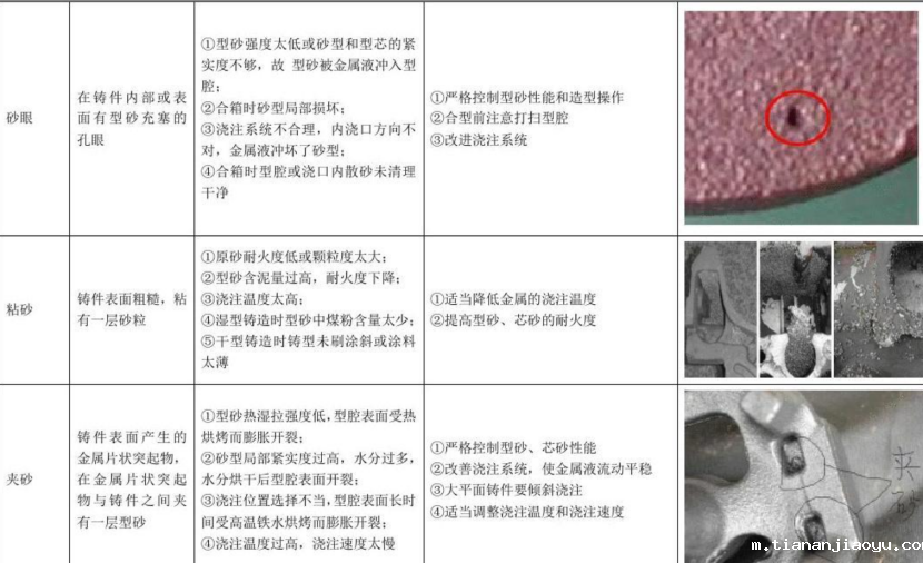 特征:在铸件表面或内部形成相对规则的孔洞,其形状与砂粒的外形一致,刚出模时可见铸件表面镶嵌的砂粒,可从中掏出砂粒,多个砂眼同时存在时,铸件表面呈桔子皮状。