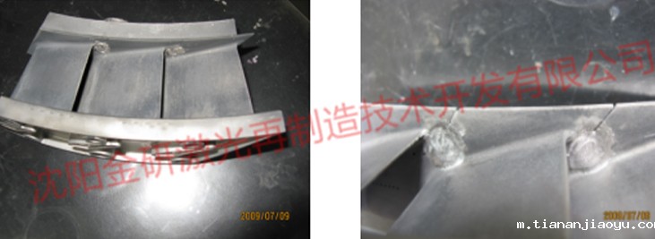 W-PM法(粉末冶金法)修复是我公司近年来的又一大重要技术突破,该方法主要应用于高温铸造合金及耐热钢的腐蚀(烧蚀)、气(冲)蚀与磨损的表面层或空洞与疲劳裂纹等缺陷修复,该工艺特点为:冶金结合,工件不变形,适用于并可获得冶金结合、大的厚度、高的硬度大缺陷的仿行修复,修复温度可达到本体强度的80%~100%,该技术成功地应用于WJ6G1型煤-焦尾气发电燃机叶片烧蚀重建,以及C27、C30的导向叶片热疲劳裂纹的愈合,特别适合AL+Ti含量大于5%的高温合金的修理。正在应用到重型燃机喷咀(导向叶片)的修复,该技术是国内首创技术。